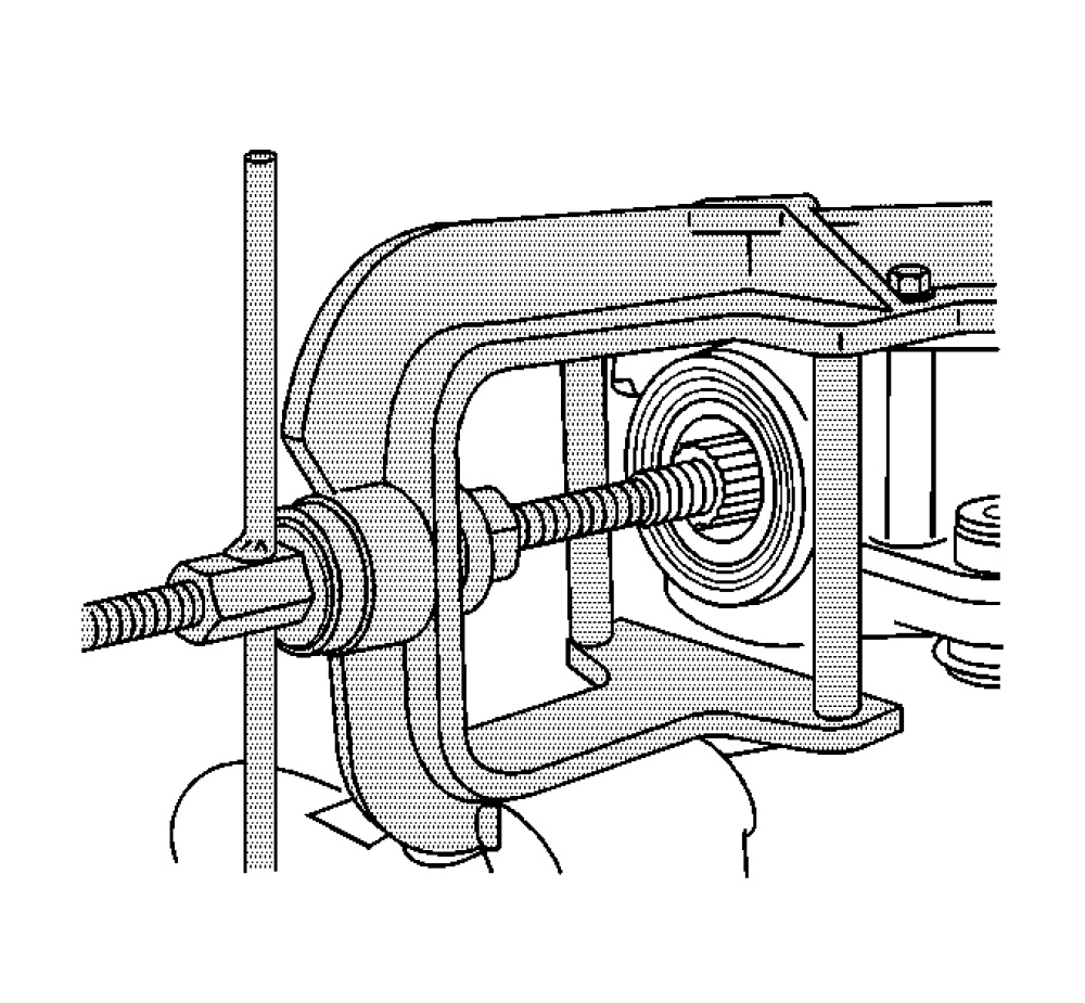 Slowly turn the forcing screw clockwise until the J 45858-5 is evenly seated behind the outer pinion bearing cup bore and the J 45858-3 is evenly seated over the outer pinion bearing cup bore.