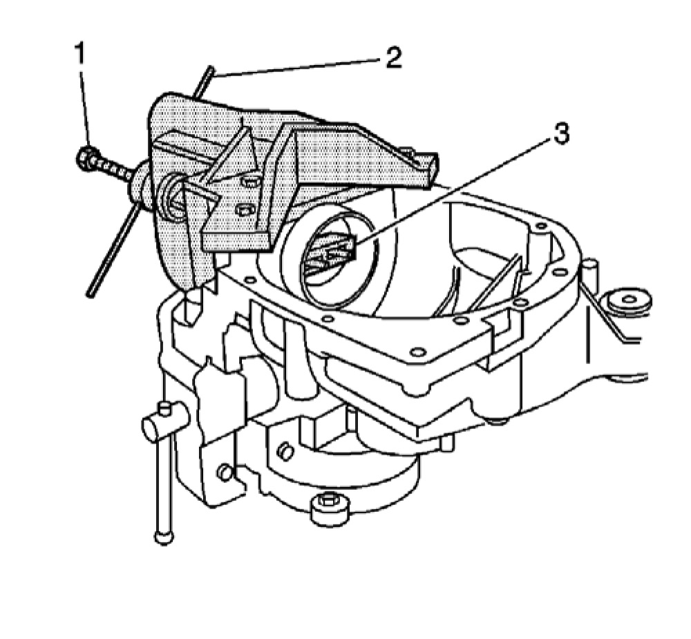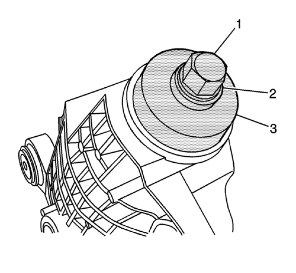 42. Install the J 45858-3 (3), the thrust bearing and the washer (2), and the forcing screw (1) over the outer pinion bearing cup bore.