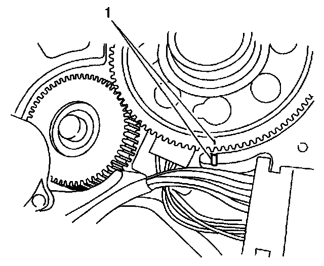 6. With the output gear/encoder assembly in hand, carefully align the casting and output gear timing marks (1).