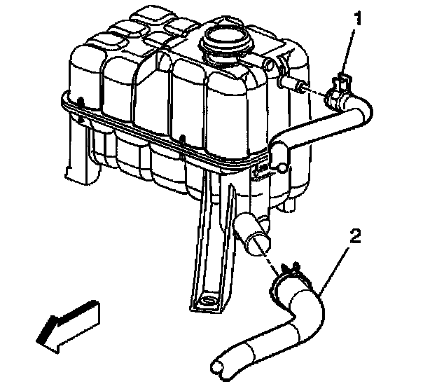 6. Remove the surge tank outlet hose (2) from the surge tank.