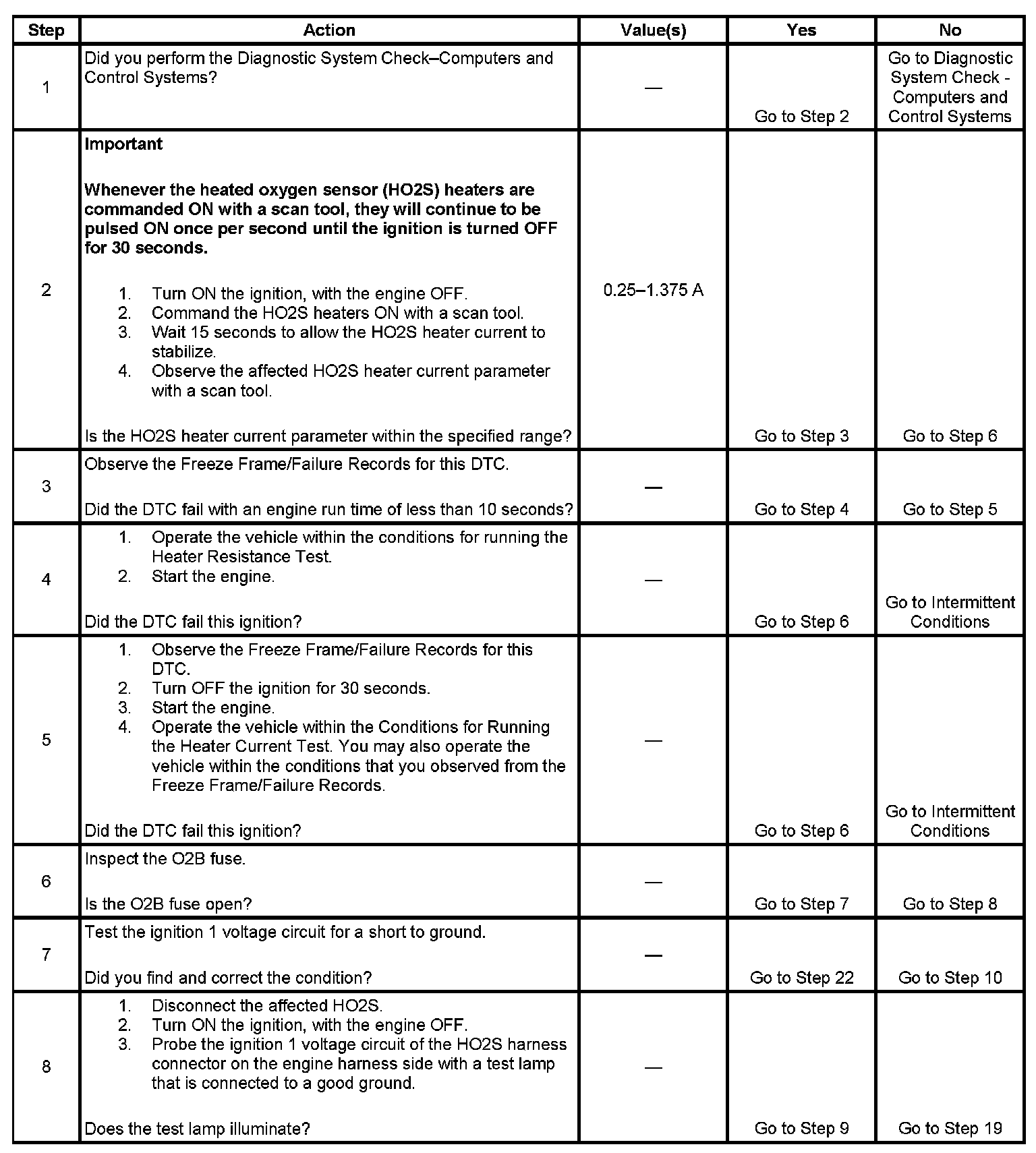 - The PCM detects that the affected HO2S Heater current parameter is more than 1.375 amps or less than 0.25 amps.