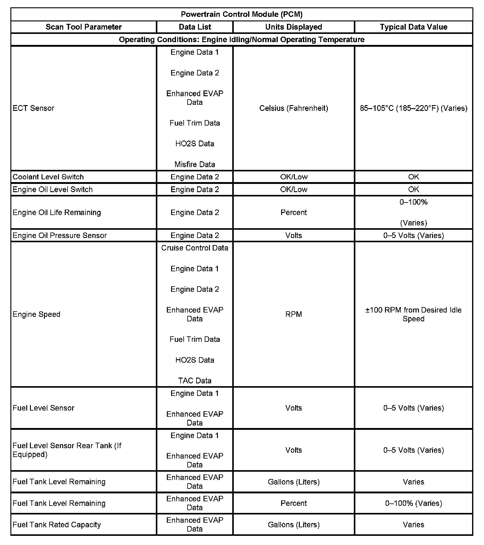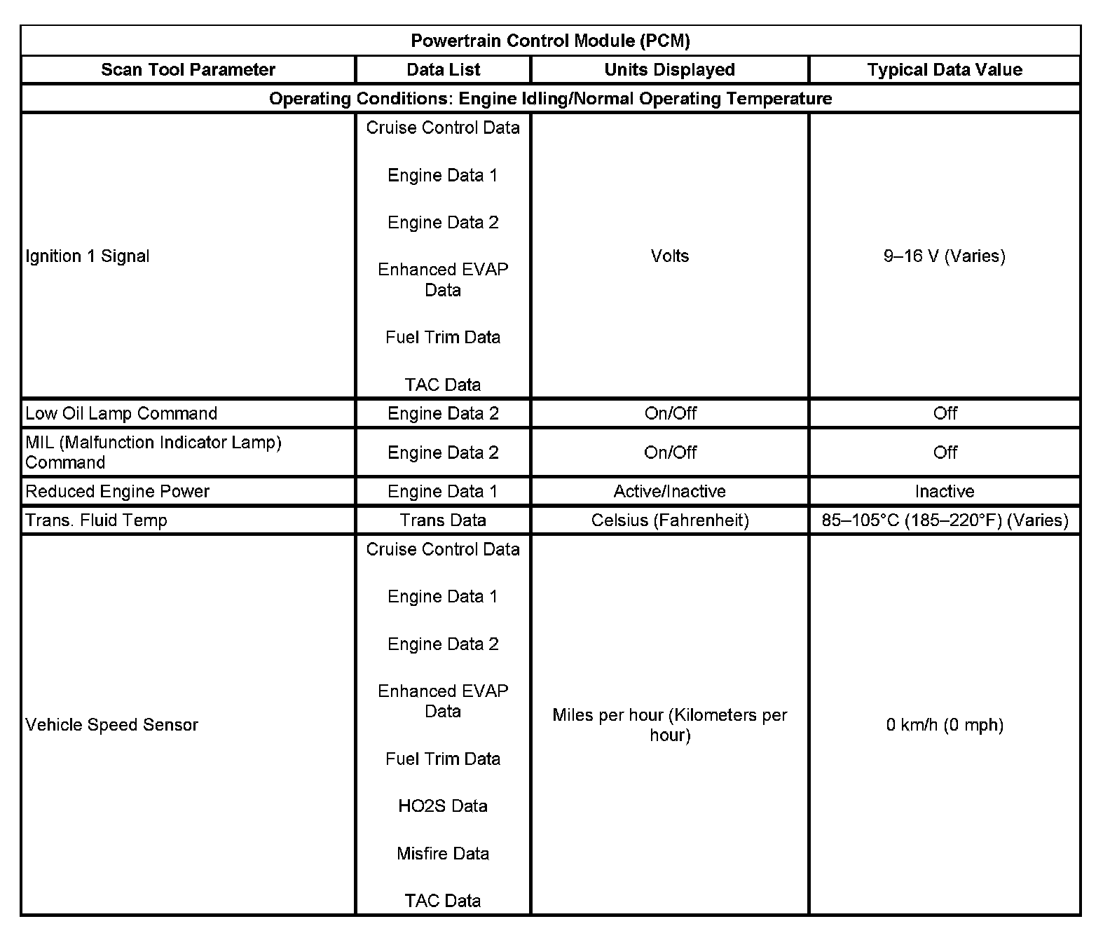 Scan Tool Data List - Powertrain Control Module (PCM)