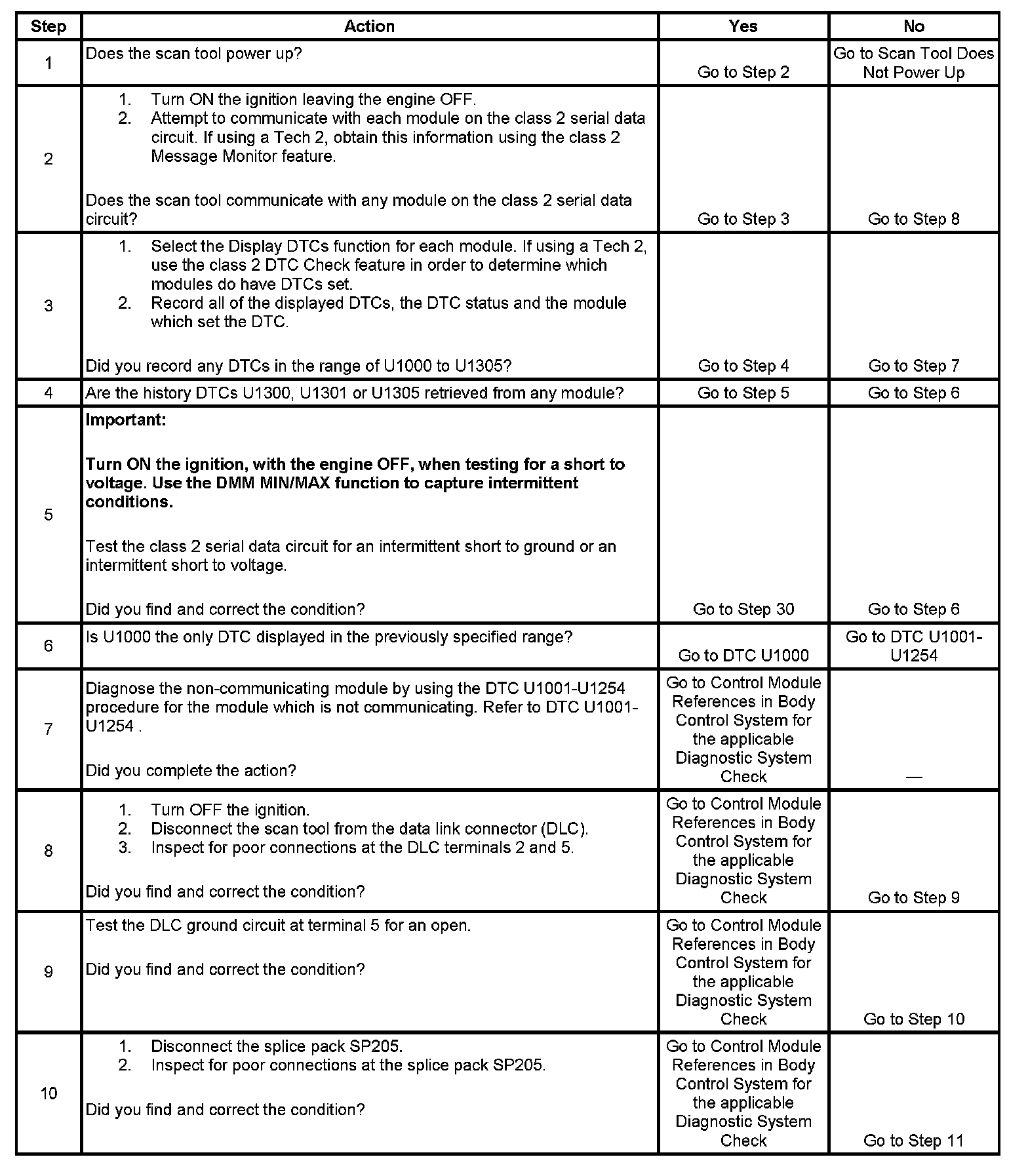 11. An open or a short in the class 2 serial data circuit between the DLC and splice pack SP205 will prevent the scan tool from communicating with any module. This condition will not set a DTC.