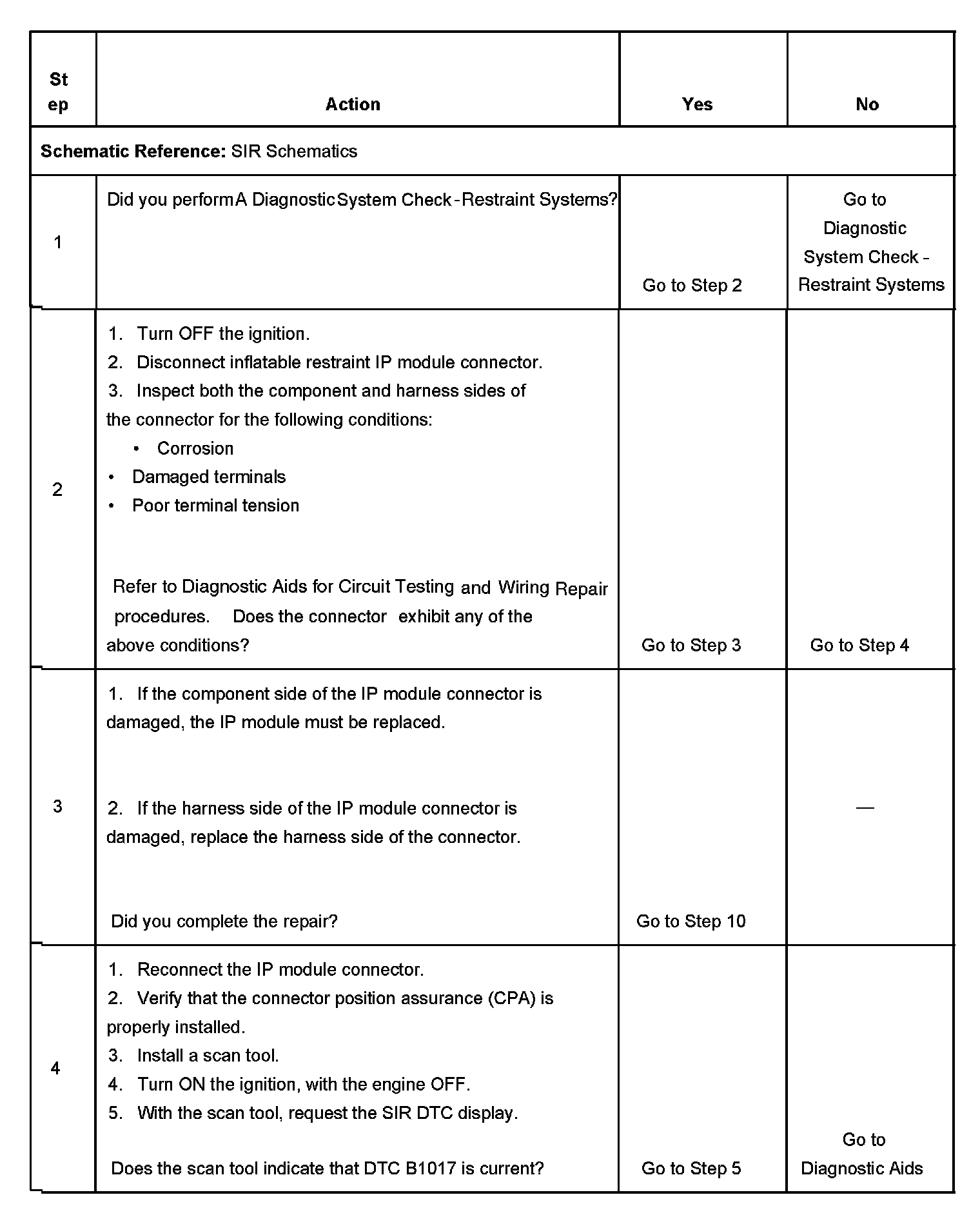 CIRCUIT DESCRIPTIONThe inflatable restraint IP module deployment loop consists of an inflatable restraint IP module, the IP module high and IP module low circuits. A shorting bar is used in the inflatable restraint IP module connector which will short together the IP module - high and IP module low circuits when the connector is disconnected, this will help to prevent unwanted deployment of the inflator module during servicing. When the ignition is turned ON, the inflatable restraint sensing and diagnostic module (SDM) performs continuous diagnostic tests on the deployment loops to check for proper circuit continuity and for shorts to ground or voltage. If a malfunction is detected, a DTC will be stored.