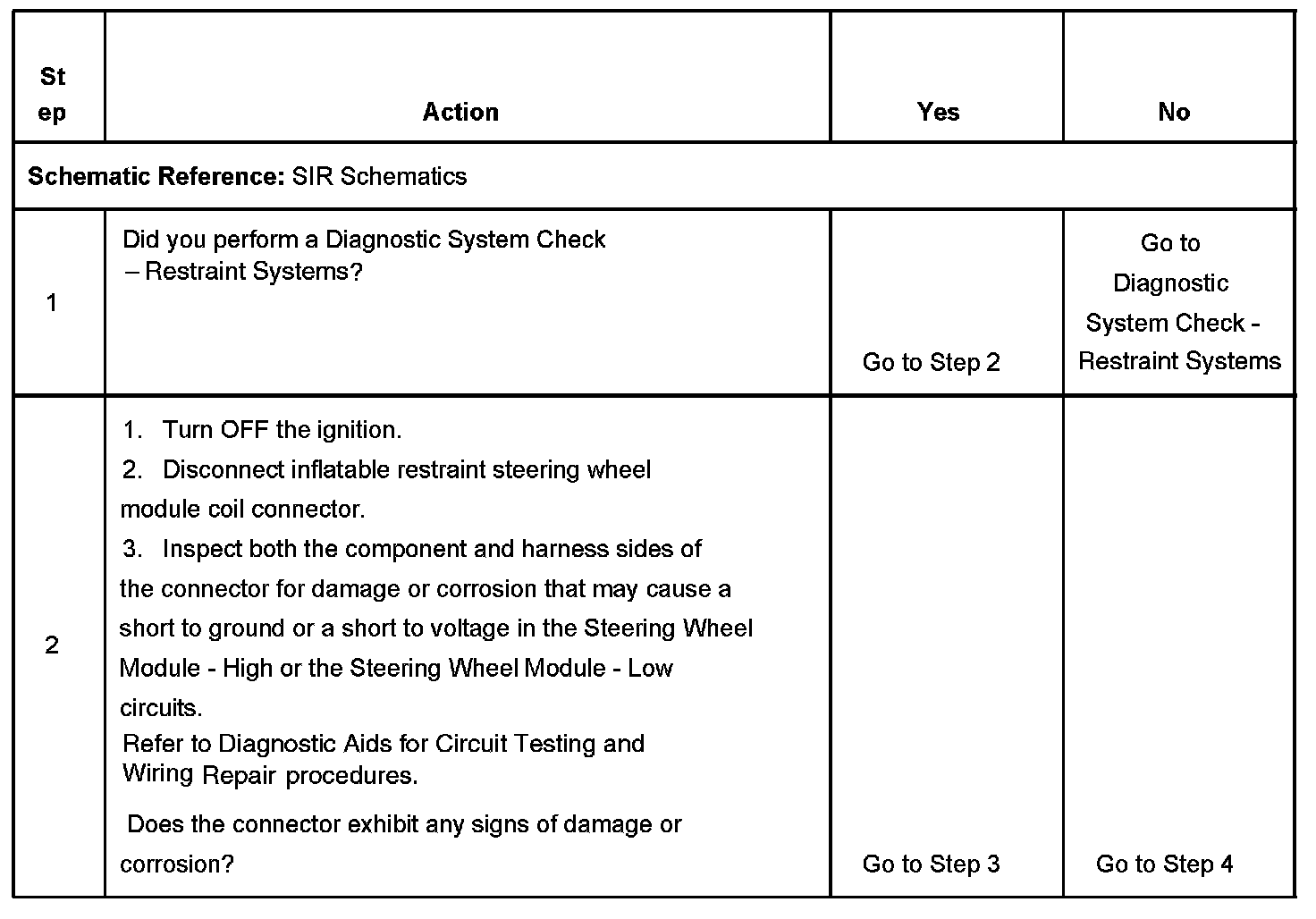 CIRCUIT DESCRIPTIONThe steering wheel module deployment loop consists of an inflatable restraint steering wheel module, an inflatable restraint steering wheel module coil, the steering wheel module - high and steering wheel module - low circuits. A shorting bar is used in the inflatable restraint steering wheel module and the inflatable restraint steering wheel module coil connectors which will short together the steering wheel module - high and steering wheel module - low circuits when the connector is disconnected, this will help to prevent unwanted deployment of the inflator module during servicing. During a frontal crash of sufficient force the SDM will allow current to flow through the deployment loop in order to deploy the inflatable restraint steering wheel module. The SDM performs continuous diagnostic tests on the deployment loops to check for proper circuit continuity and for shorts to ground or voltage. If a malfunction is detected, a DTC will be stored.