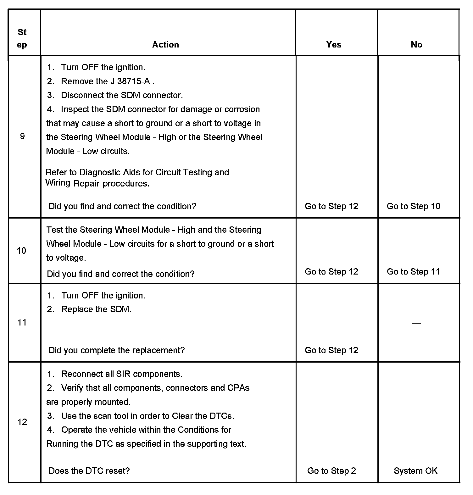 10. Tests for a short to ground or a short to voltage in the Steering Wheel Module High and Steering Wheel Module Low circuits.