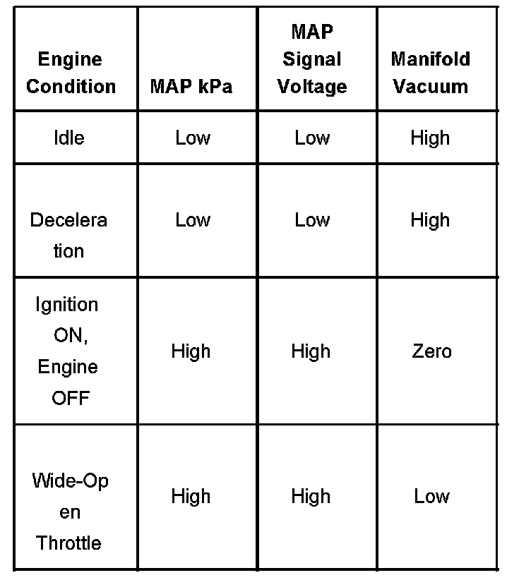 The powertrain control module (PCM) supplies 5 volts to the MAP sensor on the 5-volt reference circuit. The signal circuit returns a portion of the reference voltage to the PCM depending on the pressure inside the intake manifold. The PCM also provides a ground on the low reference circuit. The PCM should detect a low signal voltage at a low MAP, such as during idle or deceleration. The PCM should detect a high signal voltage at a high MAP, such as the ignition is ON, with the engine OFF, or at wide open throttle (WOT). The PCM monitors the MAP sensor signal for voltage outside of the normal range.