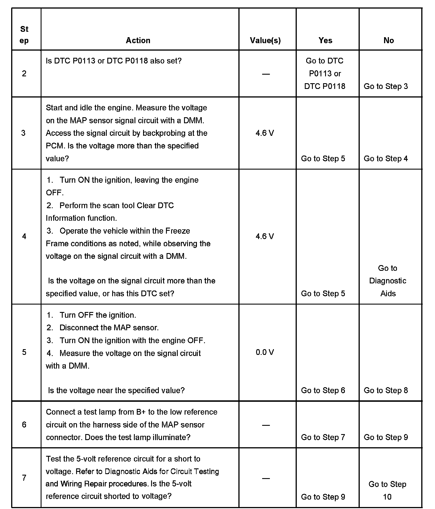 3. This step measures the MAP sensor signal to the PCM. Some conditions cause the MAP sensor display on the scan tool to show a default value. Measure the signal circuit voltage with a DMM to avoid misdiagnosis.