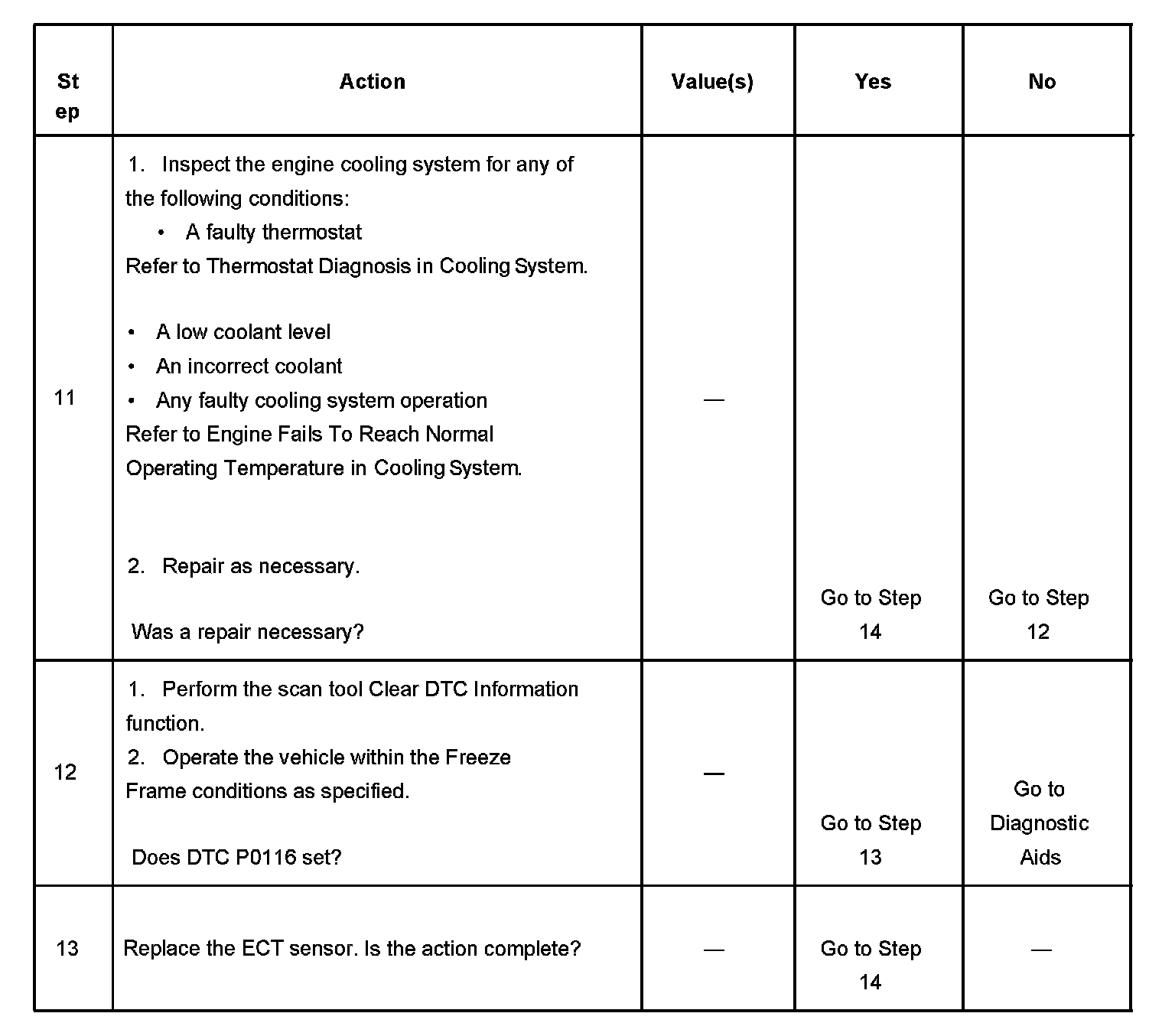11. A cooling system that prevents the engine from warming up properly and reaching the correct engine operating temperature within a specified time can cause a DTC P0116 to set. A thermostat that stays open slightly can cause a DTC P0116 to set.