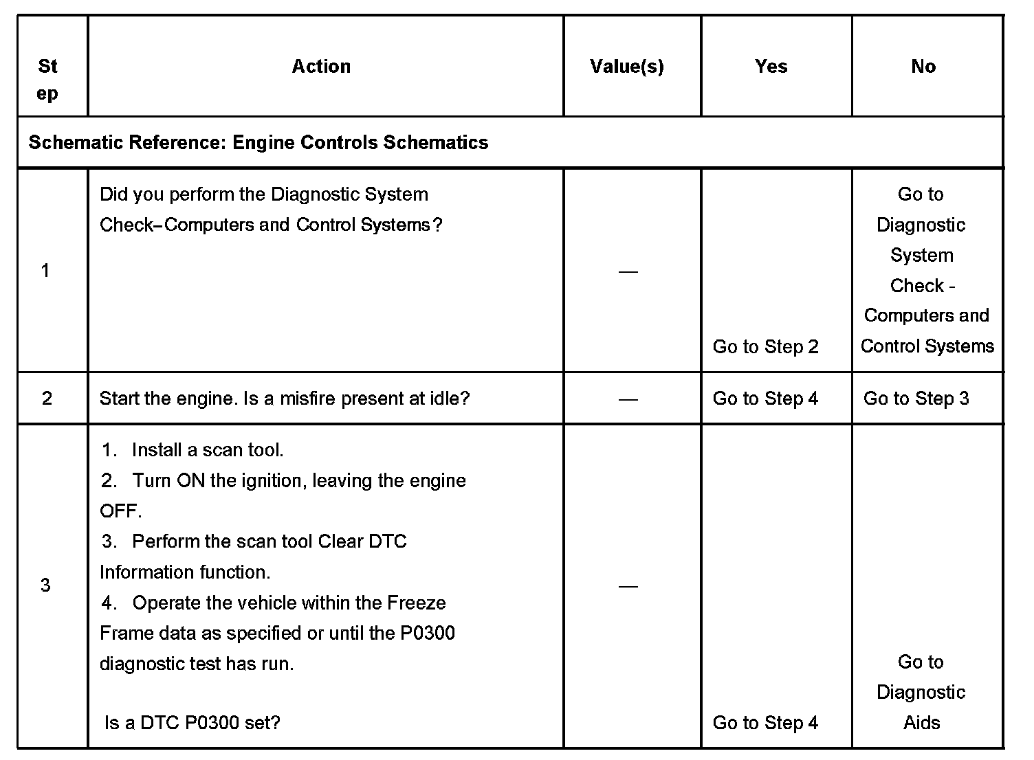 If a DTC P0300 is intermittent, driving the vehicle under the following conditions can verify whether the fault is present. Perform the scan tool Clear DTC Information function. Road test the vehicle while monitoring the DTC P0300 diagnostic on the scan tool under the Not Ran Since Code Cleared selection in the DTC Information menu. If a DTC P0300 appears in the Not Ran Since Code Cleared list, the P0300 diagnostic has not yet run. When the DTC P0300 does not appear in the Not Ran Since Code Cleared list, the P0300 diagnostic has run. If the MIL is NOT illuminated, and there is no Pending DTC Status in DTC Information, the P0300 diagnostic has passed. The DTCs MUST be cleared in order to view the Current Status of the Not Ran Since Code Cleared list. DO NOT forget that the Not Ran Since Code Cleared list only indicates that the test has run, not whether the test passed or failed. The DTC Information screen must be checked for Current or Pending status, in order to determine the outcome of the diagnostic test involved.