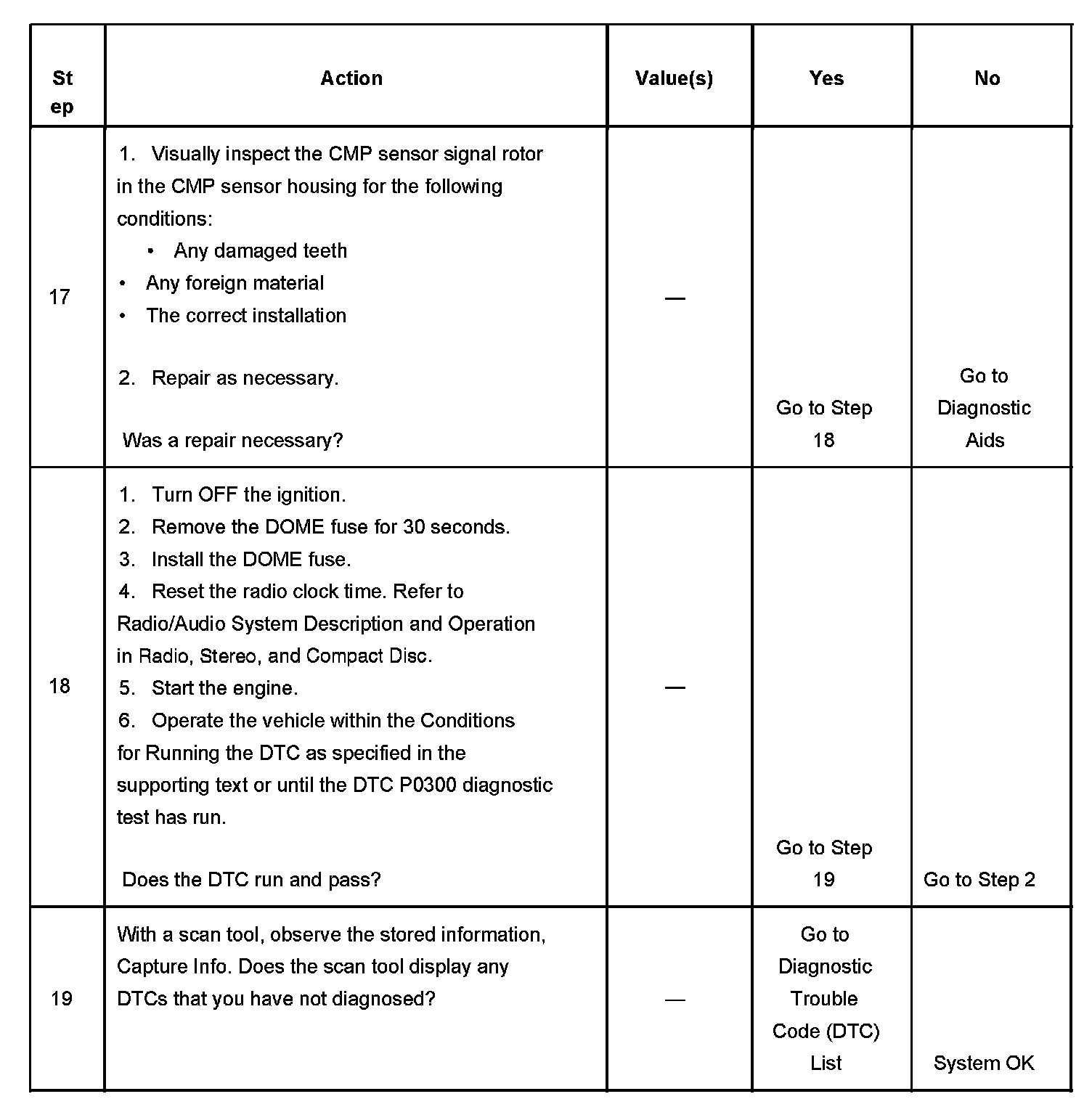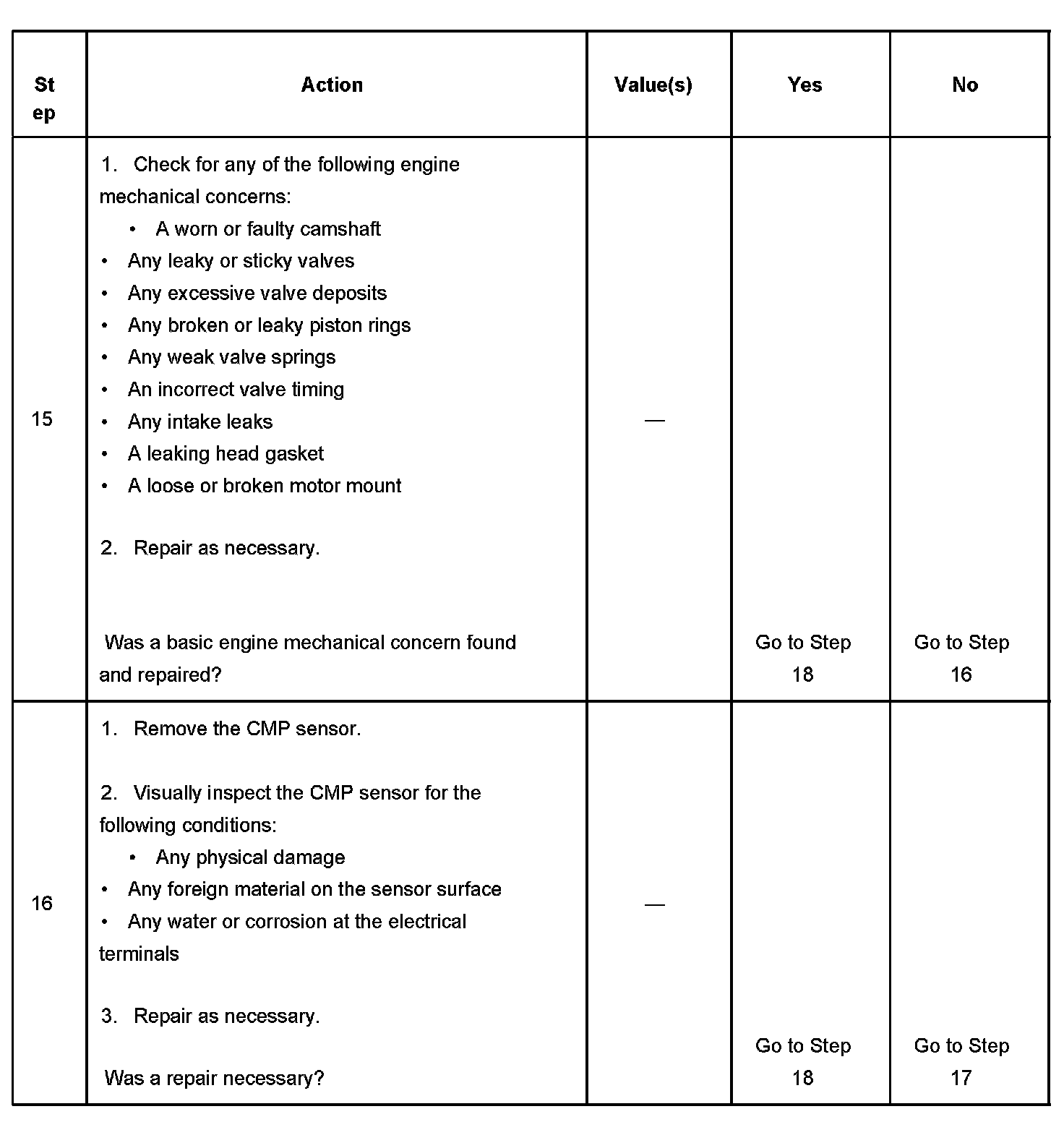 16. This step checks for faults in the CMP sensor and circuit that can cause incorrect ignition reference signals. Without continuous accurate reference signals, there is no dependable spark or fuel injector pulse. Erratic, missing, or incorrect engine reference signals can cause the engine to misfire.