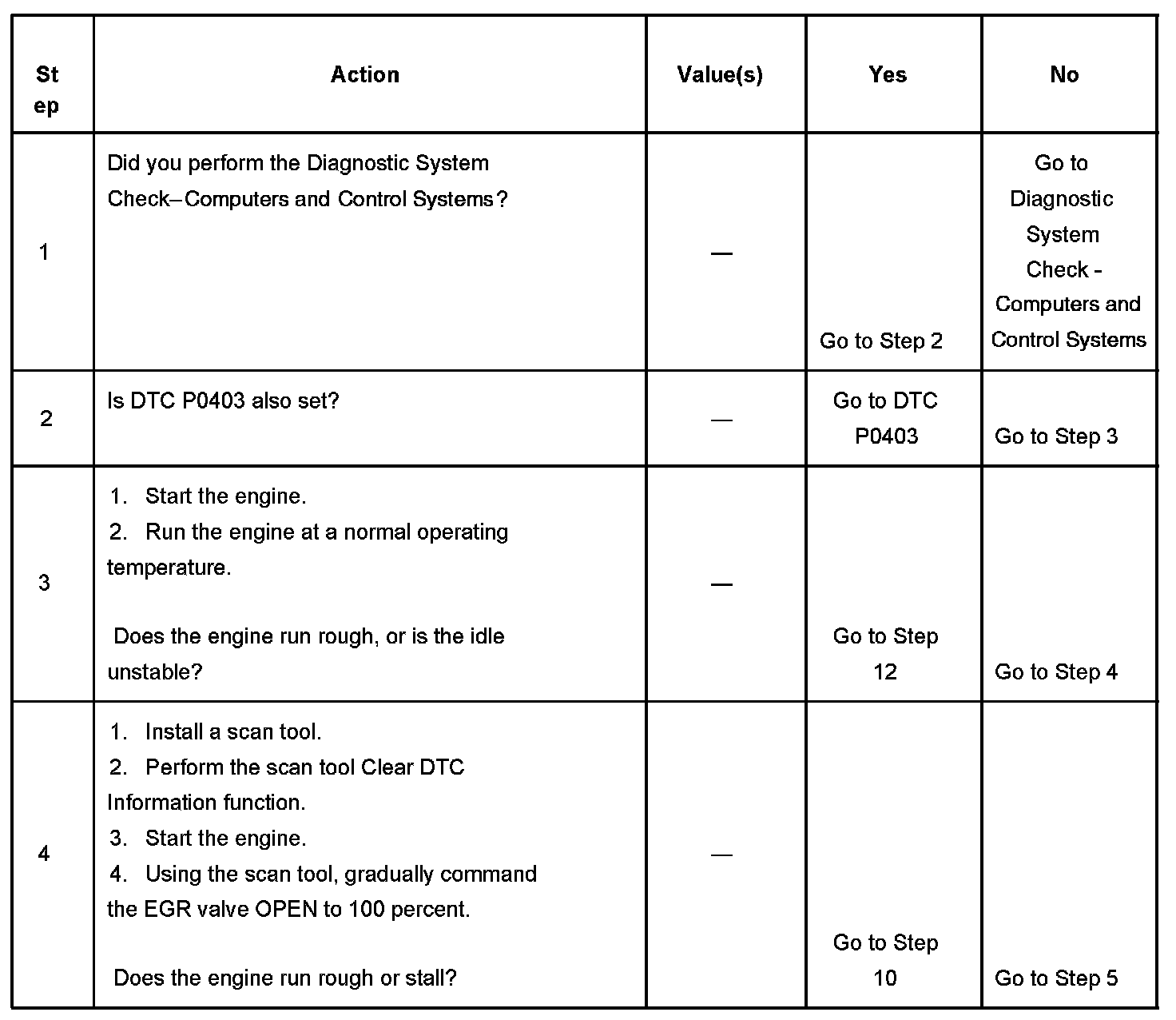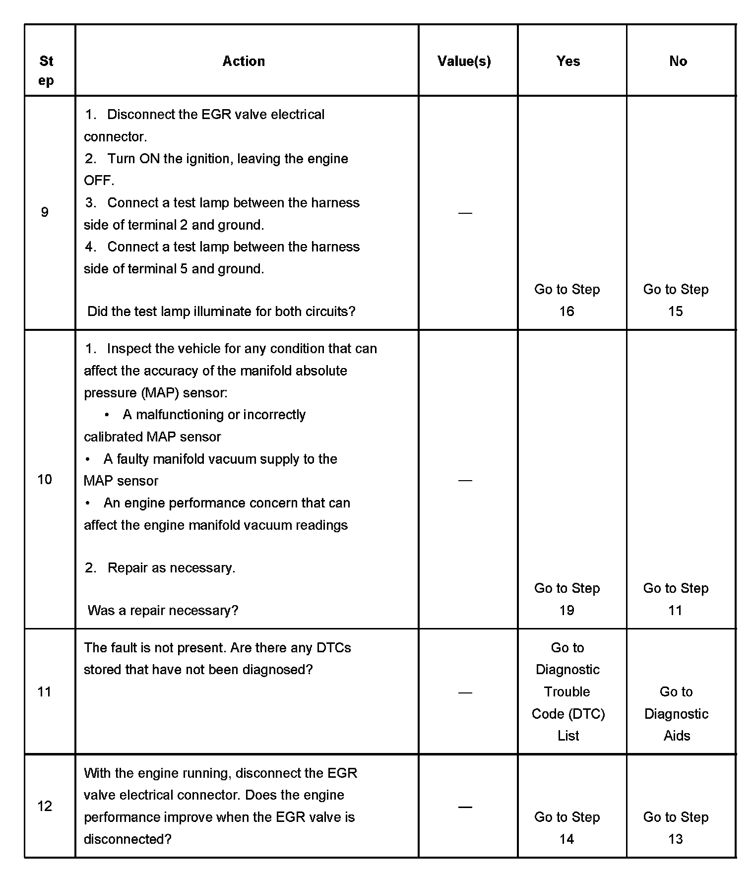 12. This step determines whether an electrical fault is the cause of the EGR valve staying open. A grounded EGR valve control circuit can cause the EGR valve to be open all the time.