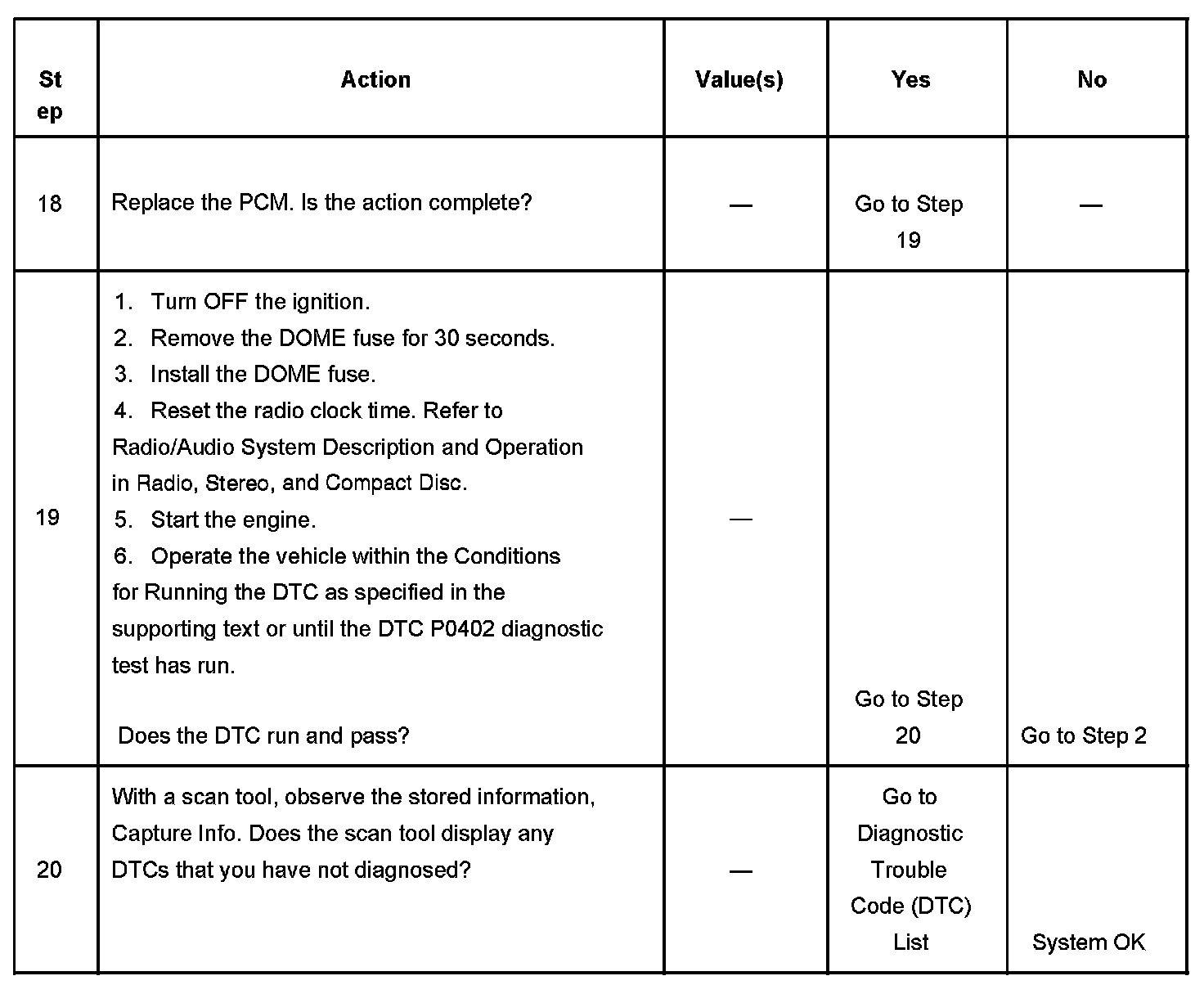 19. Clearing the DTCs by removing the DOME fuse also clears the PCM long term memory. Using the scan tool to clear DTCs leaves the long term memory active. DTC emitting diagnostics may not run to completion as expected unless the long term memory is cleared. Removal of the DOME fuse also clears the time display of the radio. The DTC P0402 diagnostic can be monitored on the scan tool under the Not Ran Since Code Cleared selection in the DTC Information menu. If a DTC P0402 appears in the Not Ran Since Code Cleared list, the DTC P0402 diagnostic has not yet run. When the DTC P0402 does not appear in the Not Ran Since Code Cleared list, the DTC P0402 diagnostic has run. If the MIL is NOT illuminated, and there is no Pending DTC Status in DTC Information, the DTC P0402 diagnostic has passed. The DTCs MUST be cleared in order to view the Current Status of the Not Ran Since Code Cleared list. DO NOT forget that the Not Ran Since Code Cleared list only indicates that the test has run, not whether the test passed or failed. The DTC Information screen must be checked for Current or Pending status, in order to determine the outcome of the diagnostic test involved.