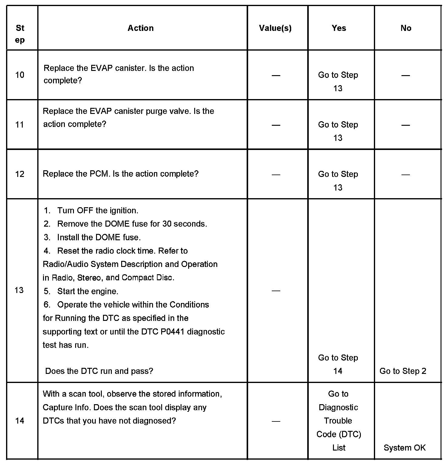 13. Clearing the DTCs by removing the DOME fuse also clears the PCM long term memory. Using the scan tool to clear DTCs leaves the long term memory active. DTC emitting diagnostics may not run to completion as expected unless the long term memory is cleared. Removal of the DOME fuse also clears the time display of the radio. The DTC P0441 diagnostic can be monitored on the scan tool under the Not Ran Since Code Cleared selection in the DTC Information menu. If a DTC P0441 appears in the Not Ran Since Code Cleared list, the DTC P0441 diagnostic has not yet run. When the DTC P0441 does not appear in the Not Ran Since Code Cleared list, the DTC P0441 diagnostic has run. If the MIL is NOT illuminated, and there is no Pending DTC Status in DTC Information, the DTC P0441 diagnostic has passed. The DTCs MUST be cleared in order to view the Current Status of the Not Ran Since Code Cleared list. DO NOT forget that the Not Ran Since Code Cleared list only indicates that the test has run, not whether the test passed or failed. The DTC Information screen must be checked for Current or Pending status, in order to determine the outcome of the diagnostic test involved.
