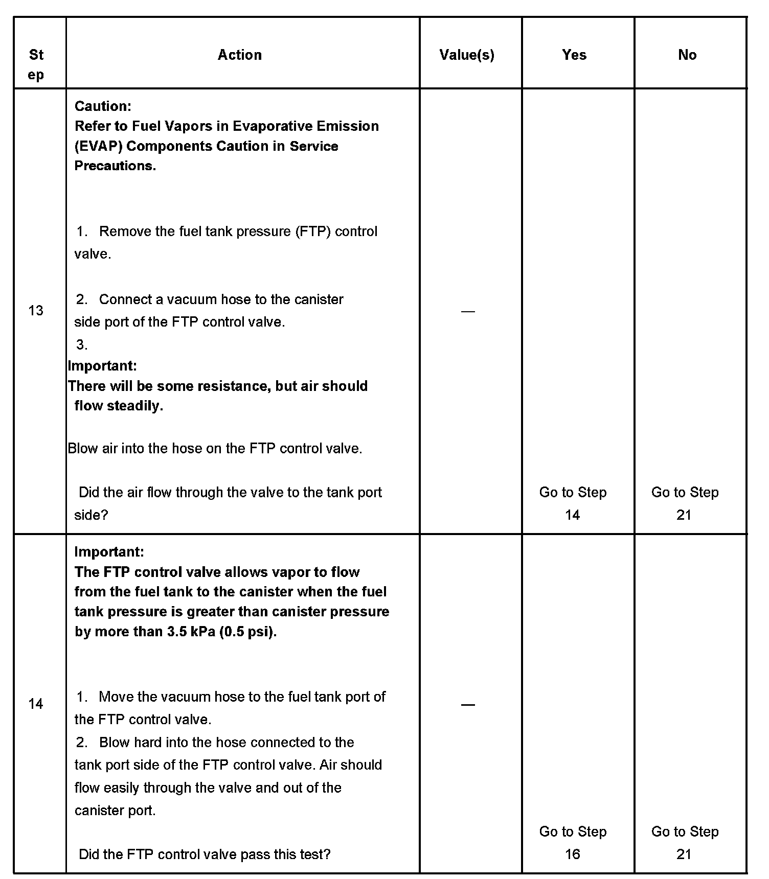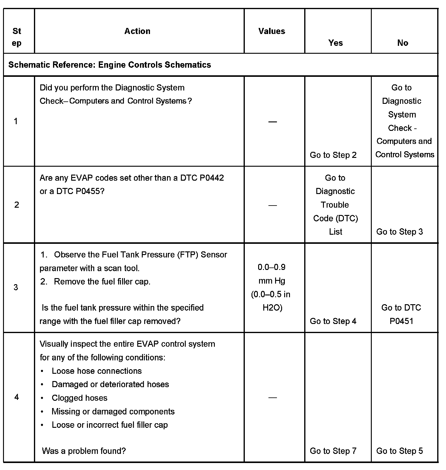 3. This step checks the operation of the FTP sensor. If the FTP sensor does not indicate near zero pressure when the fuel filler cap is removed, the FTP sensor or circuit might be faulty. The FTP sensor can be checked by using the diagnostics in DTC P0451.