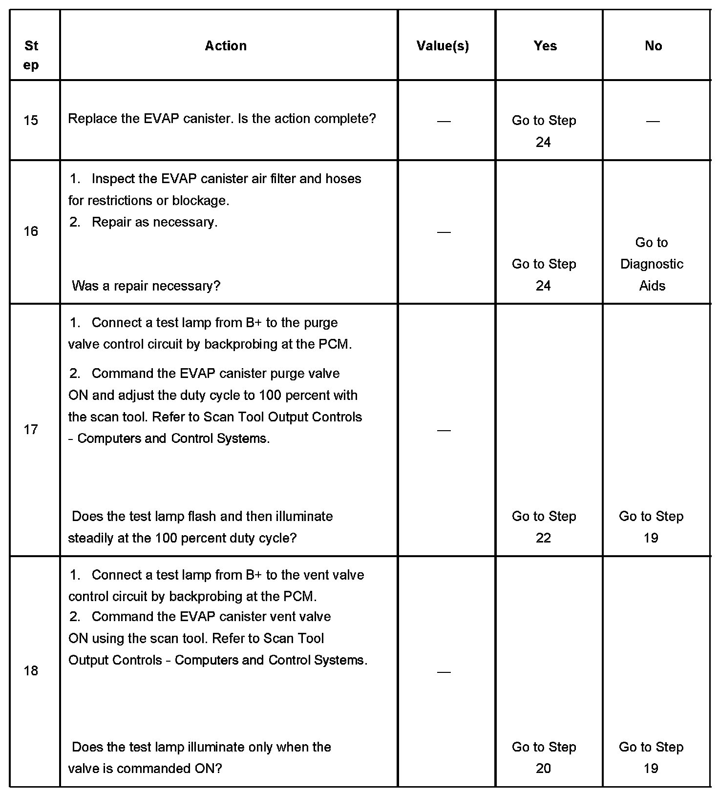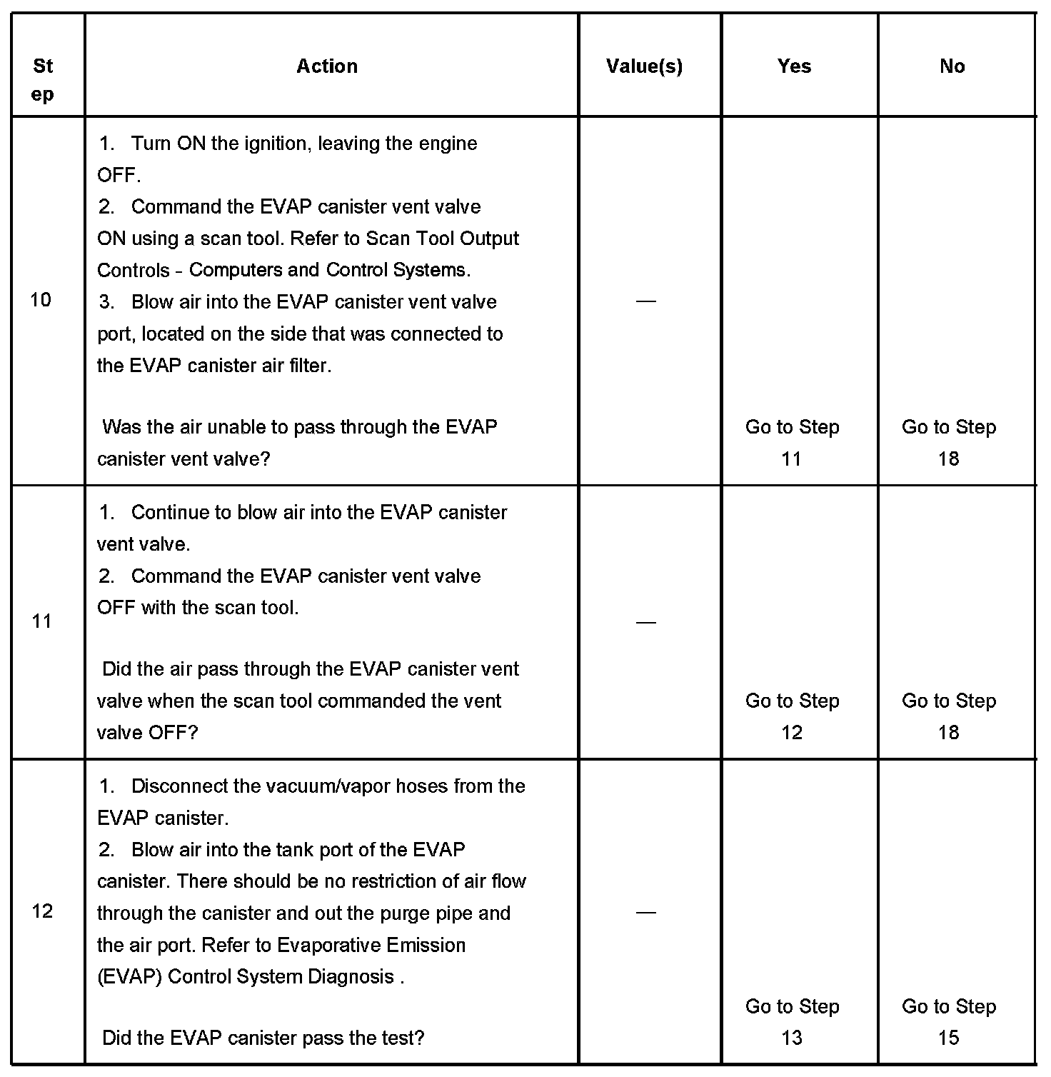 10. This step checks the operation of the EVAP canister vent valve. The output control of the EVAP canister vent valve is disabled by the PCM when any DTCs are stored and when engine speed is indicated.
