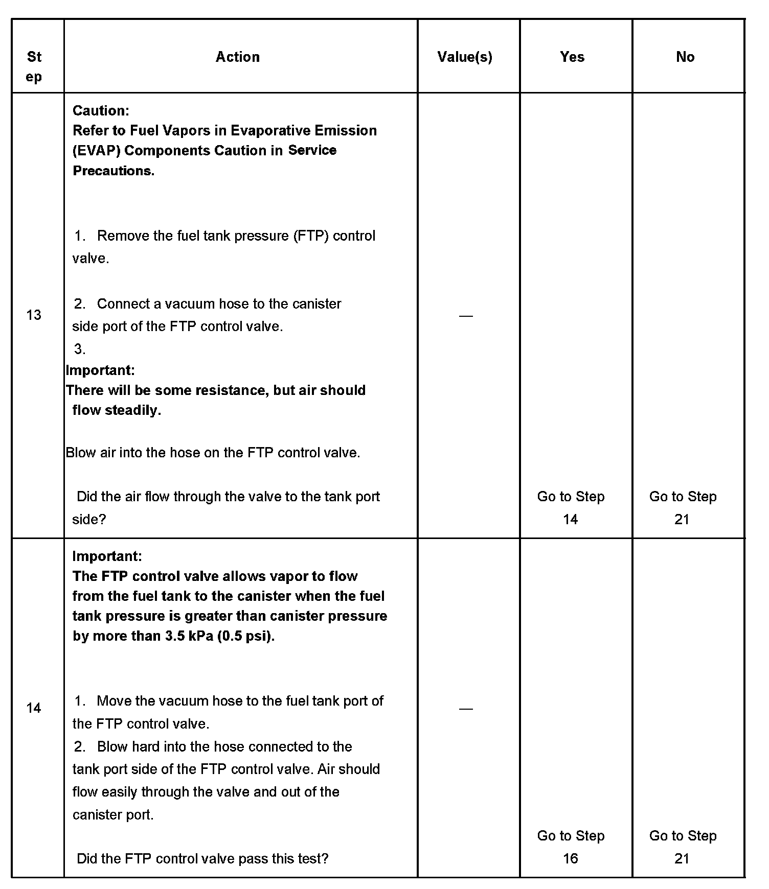 3. This step checks the operation of the FTP sensor. If the FTP sensor does not indicate near zero pressure when the fuel filler cap is removed, the FTP sensor or circuit might be faulty. The FTP sensor can be checked by using the diagnostics in DTC P0450.