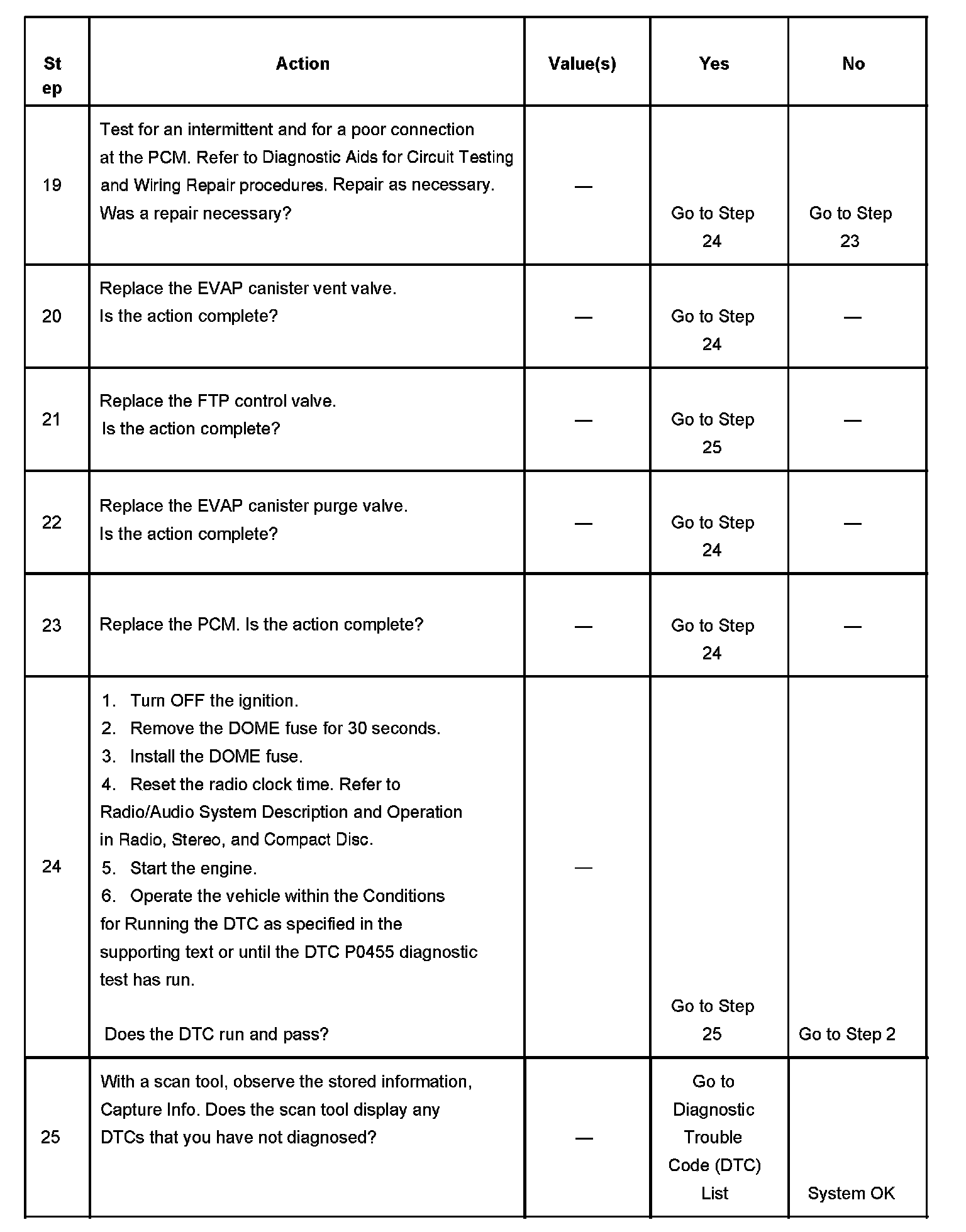 25. Clearing the DTCs by removing the DOME fuse also clears the PCM long term memory. Using the scan tool to clear DTCs leaves the long term memory active. DTC emitting diagnostics may not run to completion as expected unless the long term memory is cleared. Removal of the DOME fuse also clears the time display of the radio. The DTC P0455 diagnostic can be monitored on the scan tool under the Not Ran Since Code Cleared selection in the DTC Information menu. If a DTC P0455 appears in the Not Ran Since Code Cleared list, the DTC P0455 diagnostic has not yet run. When the DTC P0455 does not appear in the Not Ran Since Code Cleared list, the DTC P0455 diagnostic has run. If the MIL is NOT illuminated, and there is no Pending DTC Status in DTC Information, the DTC P0455 diagnostic has passed. The DTCs MUST be cleared in order to view the Current Status of the Not Ran Since Code Cleared list. DO NOT forget that the Not Ran Since Code Cleared list only indicates that the test has run, not whether the test passed or failed. The DTC Information screen must be checked for Current or Pending status, in order to determine the outcome of the diagnostic test involved.