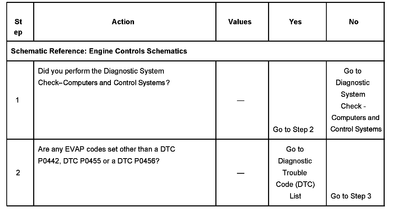 CIRCUIT DESCRIPTIONThe DTC P0456 Evaporative Emission (EVAP) System Very Small Leak Detected diagnostic monitors the operation of the EVAP system for leaks as small as 0.5 mm (0.020 inch). The EVAP control system leak detection diagnostic strategy is based on applying vacuum to the EVAP system and monitoring vacuum decay. The powertrain control module (PCM) monitors the vacuum level via the fuel tank pressure sensor input. The PCM turns ON the EVAP canister purge valve and the EVAP vent valve, allowing the engine manifold pressure to draw a small vacuum on the entire EVAP system. If sufficient vacuum cannot be sustained over a given period of time, a small leak or a malfunction is suspected and DTC P0456 sets. The EVAP system used with this powertrain is part of an on-board refueling vapor recovery (ORVR) fuel system.