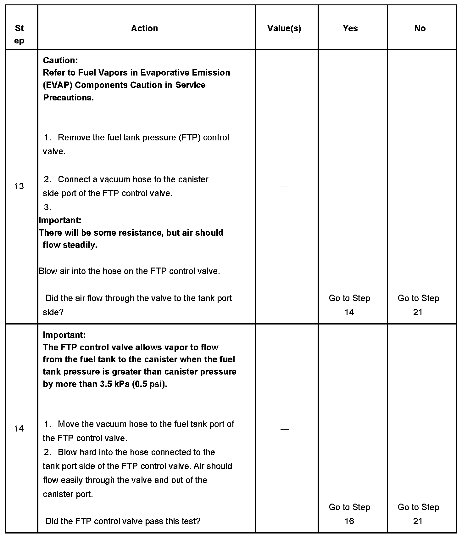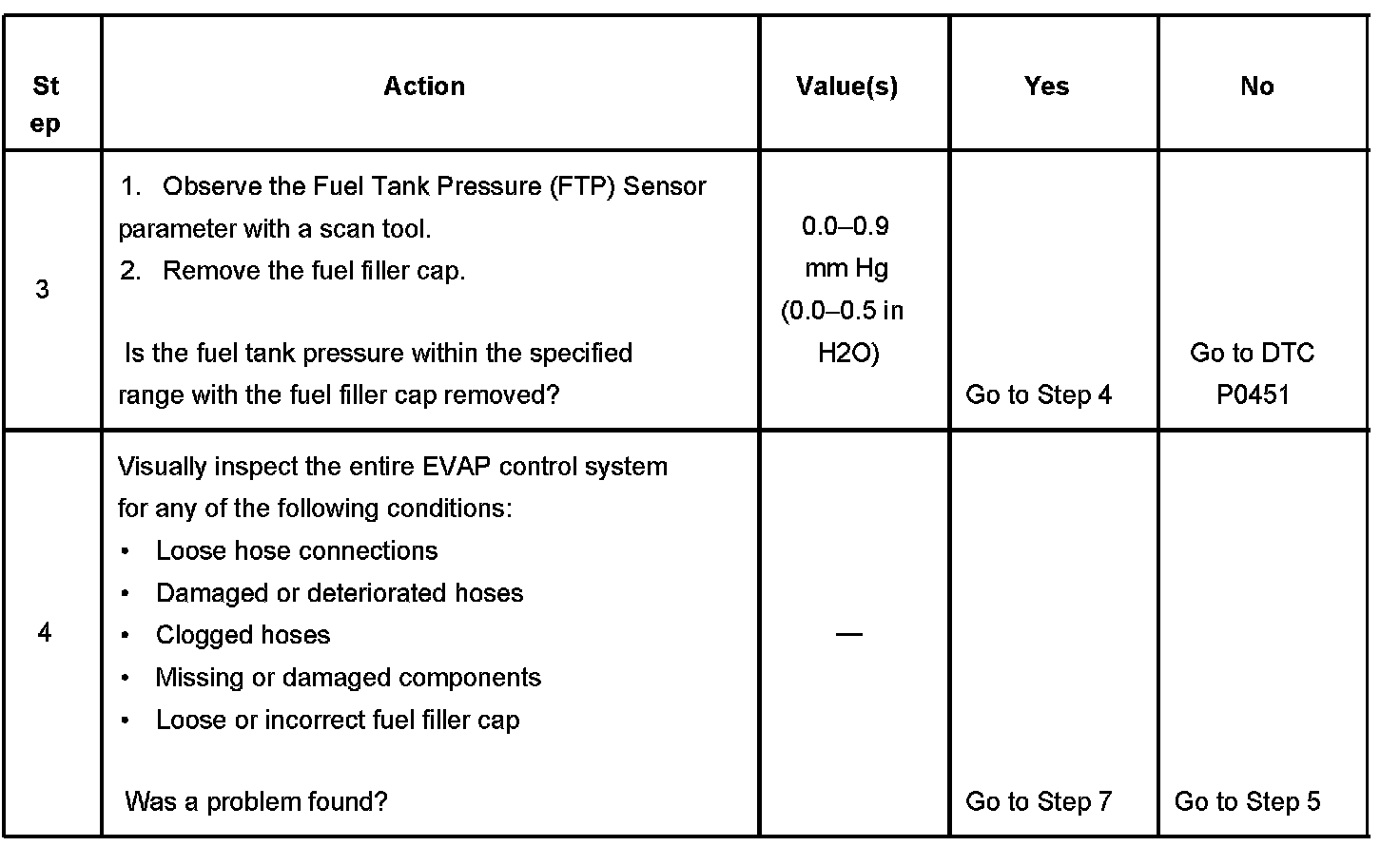 3. This step checks the operation of the FTP sensor. If the FTP sensor does not indicate near zero pressure when the fuel filler cap is removed, the FTP sensor or circuit might be faulty. The FTP sensor can be checked by using the diagnostics in DTC P0451.