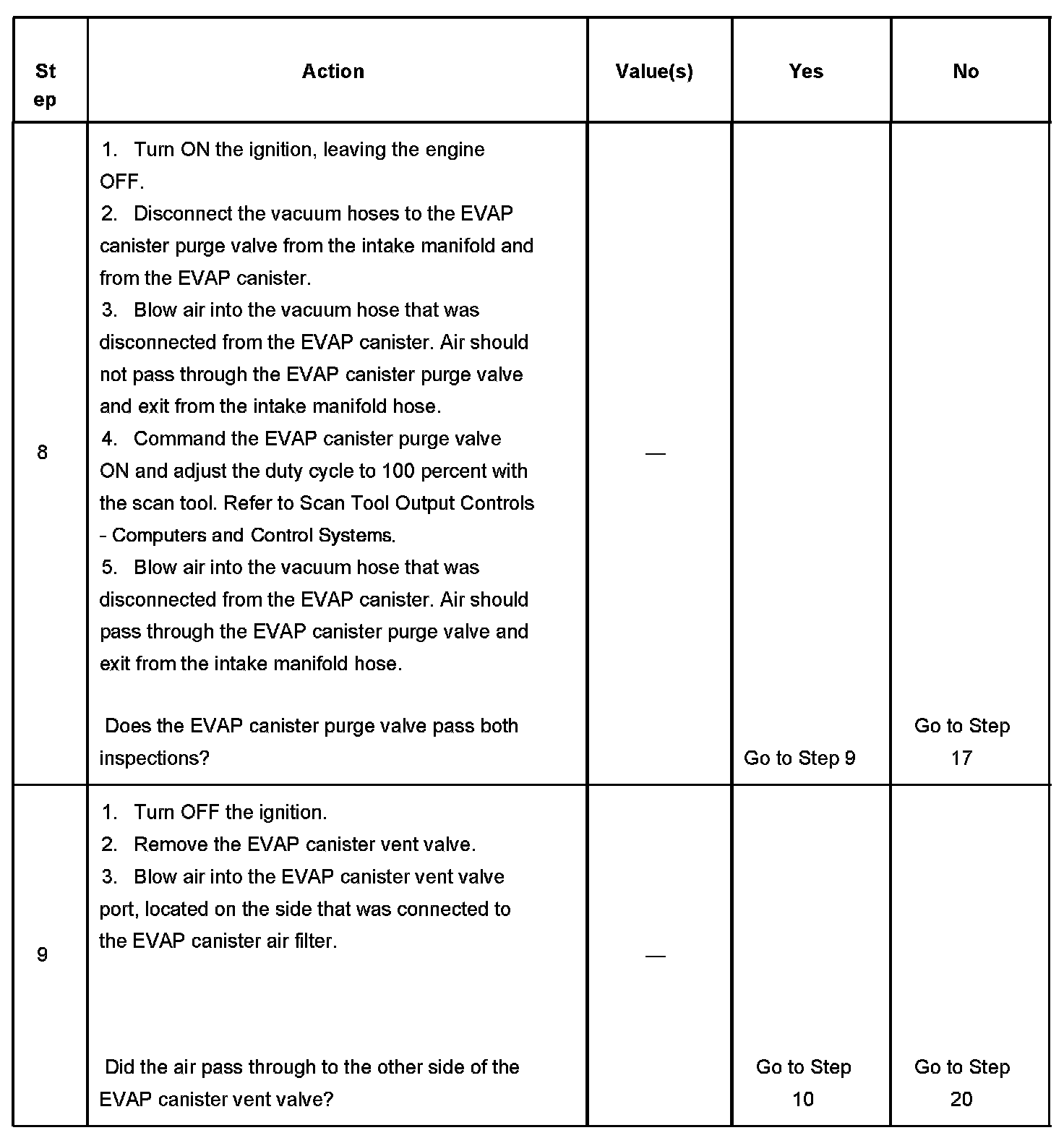 9. This step checks the operation of the EVAP canister purge valve. The duty cycle control of the EVAP canister purge valve is disabled by the PCM when any DTCs are stored and when engine speed is indicated.