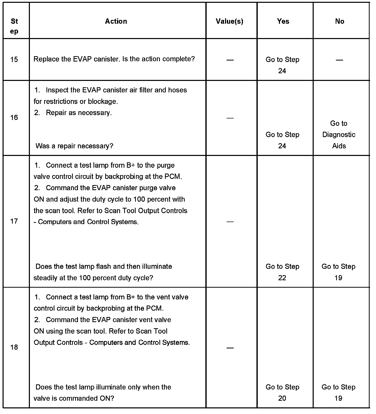 10. This step checks the operation of the EVAP canister vent valve. The output control of the EVAP canister vent valve is disabled by the PCM when any DTCs are stored and when engine speed is indicated.