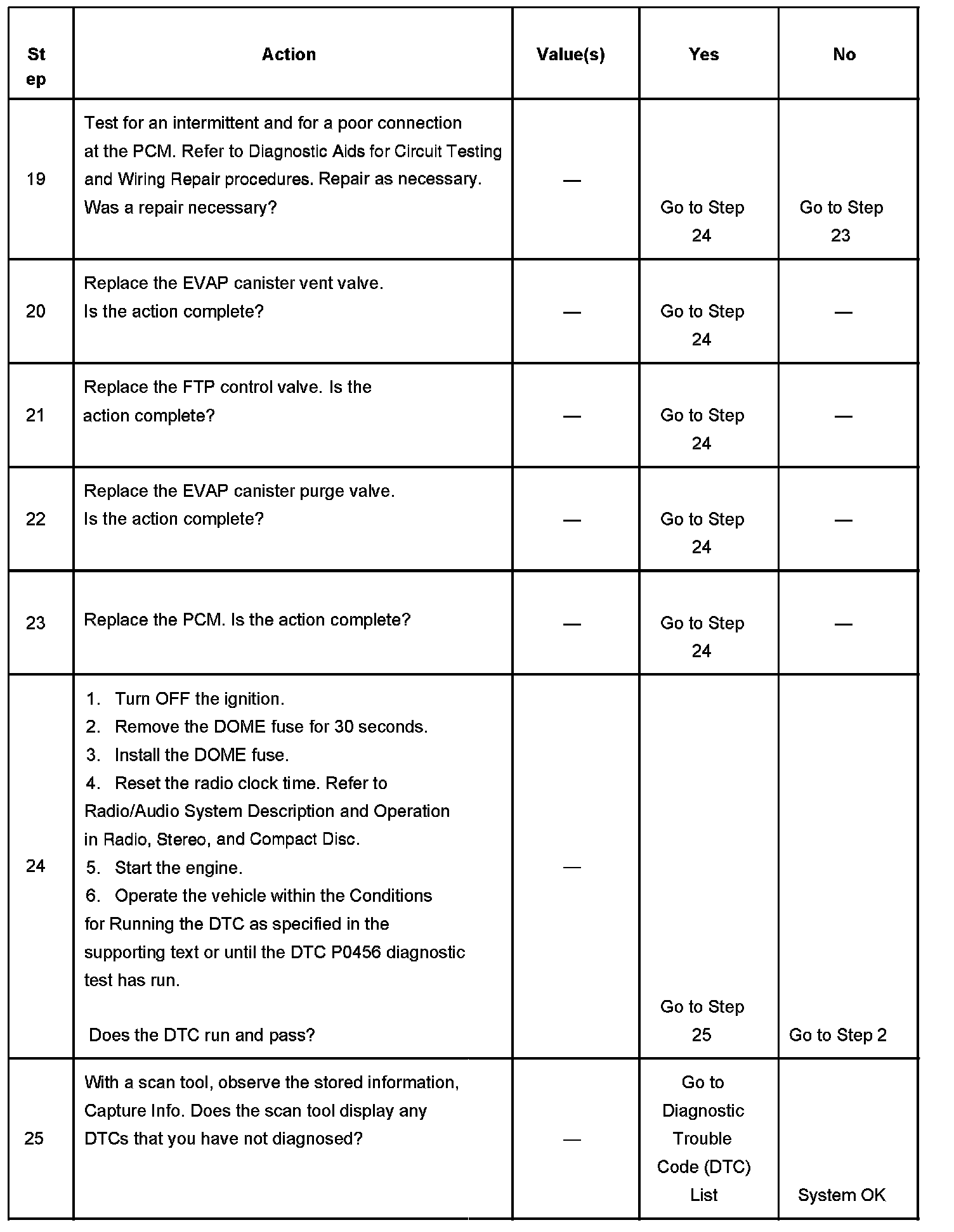 25. Clearing the DTCs by removing the DOME fuse also clears the PCM long term memory. Using the scan tool to clear DTCs leaves the long term memory active. DTC emitting diagnostics may not run to completion as expected unless the long term memory is cleared. Removal of the DOME fuse also clears the time display of the radio. The DTC P0456 diagnostic can be monitored on the scan tool under the Not Ran Since Code Cleared selection in the DTC Information menu. If a DTC P0456 appears in the Not Ran Since Code Cleared list, the DTC P0456 diagnostic has not yet run. When the DTC P0456 does not appear in the Not Ran Since Code Cleared list, the DTC P0456 diagnostic has run. If the MIL is NOT illuminated, and there is no Pending DTC Status in DTC Information, the DTC P0456 diagnostic has passed. The DTCs MUST be cleared in order to view the Current Status of the Not Ran Since Code Cleared list. DO NOT forget that the Not Ran Since Code Cleared list only indicates that the test has run, not whether the test passed or failed. The DTC Information screen must be checked for Current or Pending status, in order to determine the outcome of the diagnostic test involved.