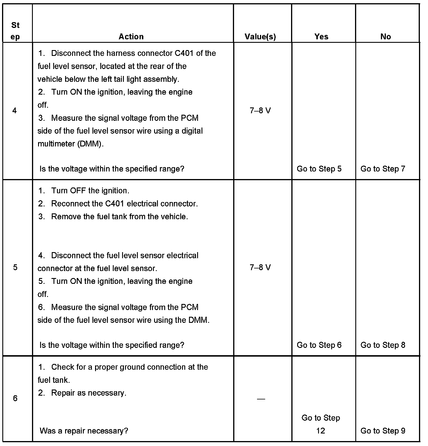 3. This step checks for a faulty PCM. If the fuel gage indicates the correct amount of fuel, there is a voltage fault within the PCM.