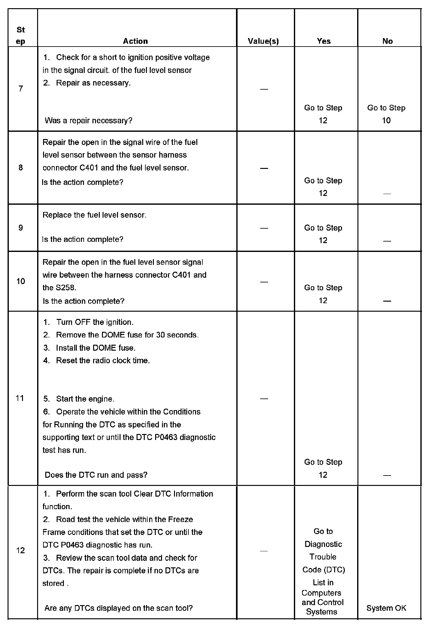 If the DTC P0463 cannot be duplicated, the information included in the Freeze Frame data can be useful in determining the vehicle operating conditions when the DTC was first set.
