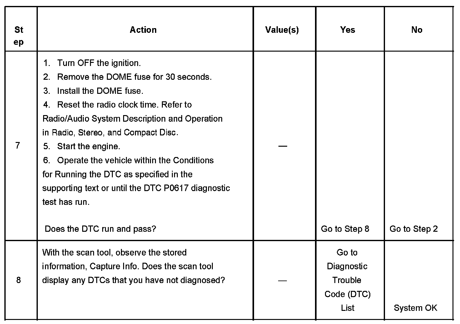 7. Clearing the DTCs by removing the DOME fuse also clears the PCM long term memory. Using the scan tool to clear DTCs leaves the long term memory active. DTC emitting diagnostics may not run to completion as expected unless the long term memory is cleared. Removal of the DOME fuse also clears the time display of the radio. The DTC P0617 diagnostic can be monitored on the scan tool under the Not Ran Since Code Cleared selection in the DTC Information menu. If a DTC P0617 appears in the Not Ran Since Code Cleared list, the DTC P0617 diagnostic has not yet run. When the DTC P0617 does not appear in the Not Ran Since Code Cleared list, the DTC P0617 diagnostic has run. If the MIL is NOT illuminated, and there is no Pending DTC Status in DTC Information, the DTC P0617 diagnostic has passed. The DTCs MUST be cleared in order to view the Current Status of the Not Ran Since Code Cleared list. DO NOT forget that the Not Ran Since Code Cleared list only indicates that the test has run, not whether the test passed or failed. The DTC Information screen must be checked for Current or Pending status, in order to determine the outcome of the diagnostic test involved.