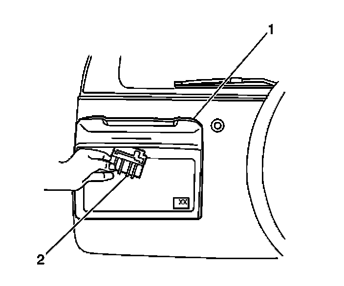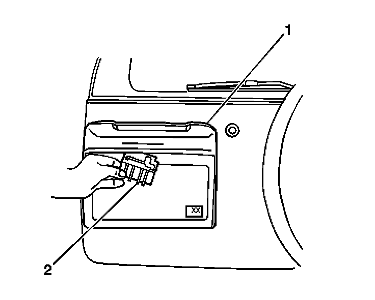 3. Remove the rear door outside handle (2) from the rear license plate housing (1).
