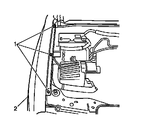 7. Remove the fender to door jamb mounting bolt (1) which secures the fender (2).