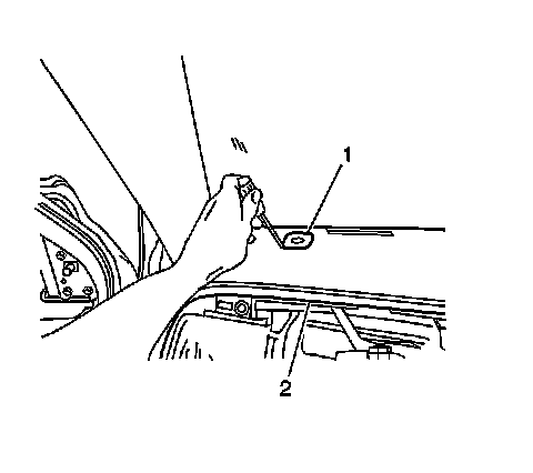 28. Position the hood latch release handle (1) aside in order to gain the necessary clearance to remove the I/P assembly (3).