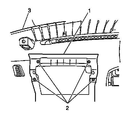 4. Install the I/P passengers knee bolster panel (1) to the I/P assembly (3). Secure the panel with the 4 screws (2).