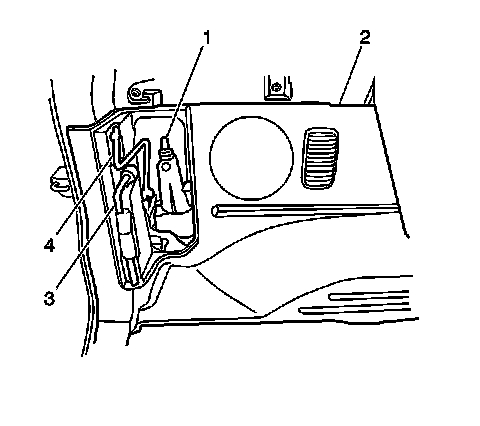 3. Install the lug wrench (3) and the jack handle (4) to the rear quarter lower trim panel (2).