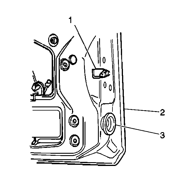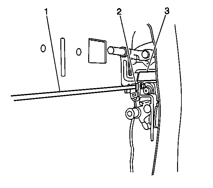 3. Install the rear door lock cylinder control rod (1) to the rear door lock (3). Secure the rod by closing the rear door lock cylinder control rod retainer (2).
