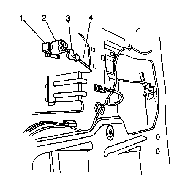 4. Install the rear door lock cylinder control rod (4) to the rear door lock cylinder (2). Secure the rod by closing the rear door lock cylinder control rod retainer (3).