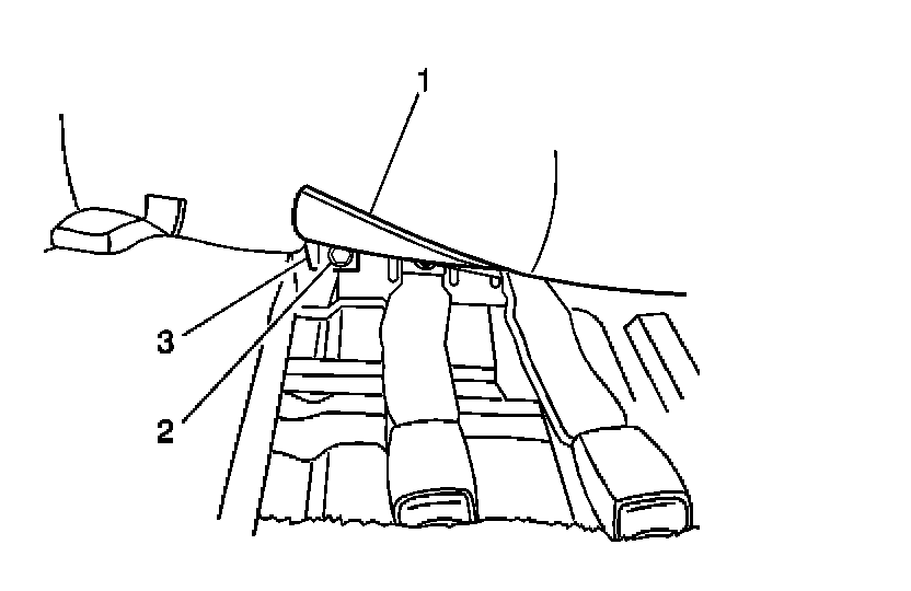 1. Pull the rear seat pull strap (2) while raising the back of the left rear seat cushion (3).