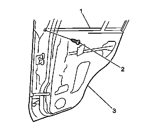1. Install the rear side door window outer sealing strip (1) to the rear side door (3) by pressing into place. Secure the strip with the screw (2).