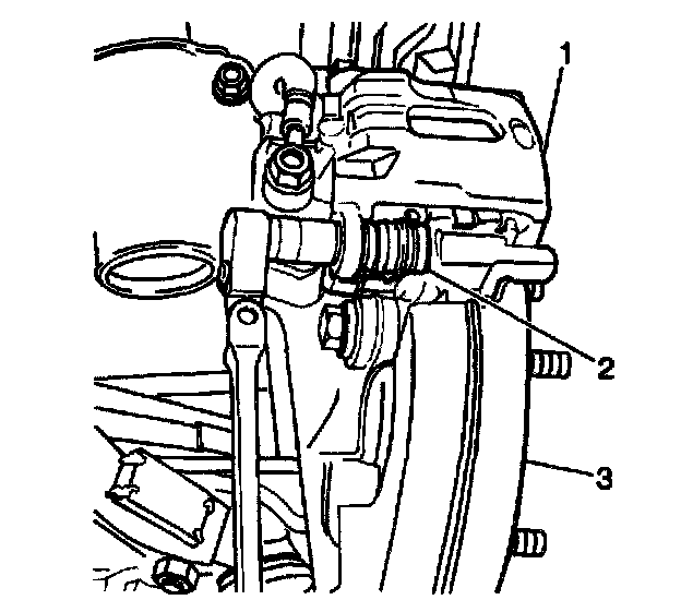1. Install the caliper (1) to the caliper bracket. Secure with 2 caliper pin bolts.