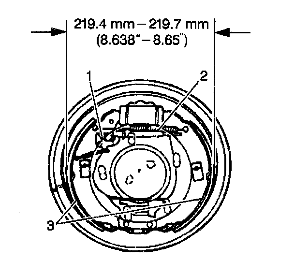 1. Before installing the drum, measure the outer diameter of the brake shoes (3). The outer diameter of the brake shoes should be between 219.4 mm (8.638 inch) and 219.7 mm (8.650 inch). If the outer diameter of the brake shoes is not within specification, turn the adjuster (2) in order to adjust the outer diameter of the shoes.