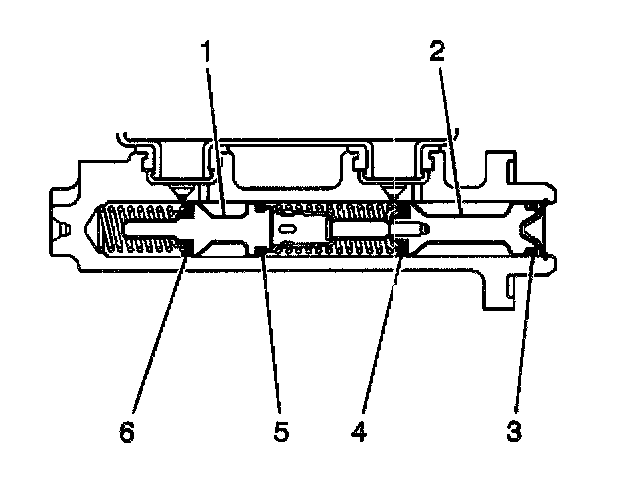 8. If the brake pedal apply did not feel spongy, and the brake pedal travel was initially steady and not excessive, but then gradually fell, then the master cylinder requires overhaul or replacement due to an internal leak past the secondary piston (1) from the secondary piston primary seal (6) or secondary seal (5).
