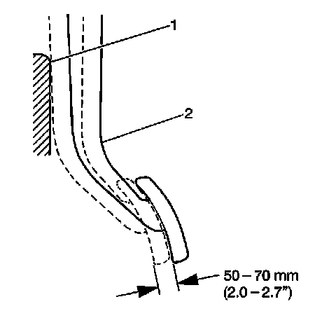 3. Depress the clutch pedal (2) to within 20-30 mm (0.8-1.2 in) from the floor (1).