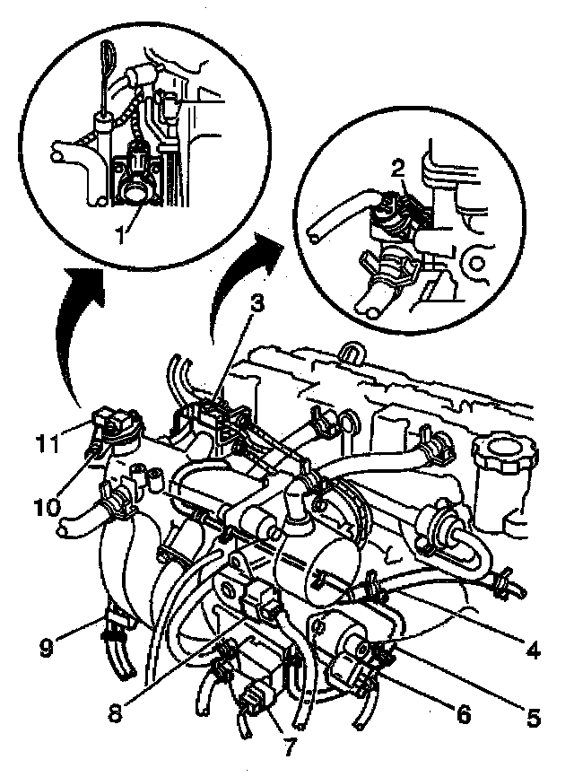 12. Remove the coolant hoses (4,5) from the throttle body and intake manifold.