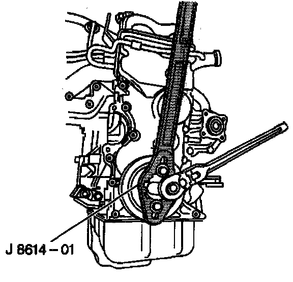 3. Install the crankshaft pulley retaining bolt using the J 8614-01 to prevent crankshaft rotation when tightening the bolt.