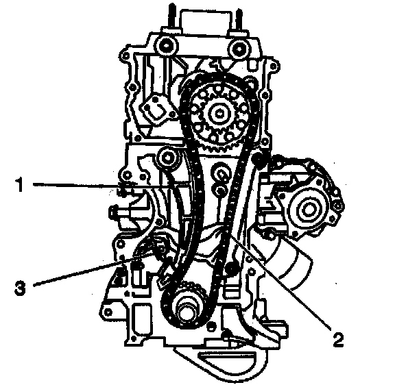 - The crankshaft keyway (3) is aligned with the mark on the engine block (3).