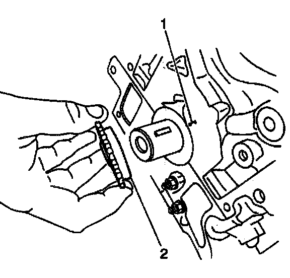 4. Install the timing chain to the idler sprocket by aligning the dark blue link (1) of the timing chain with the mark on the sprocket (2).