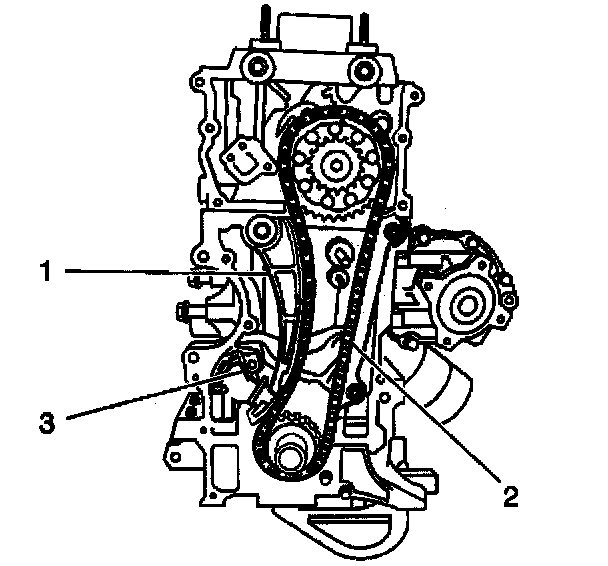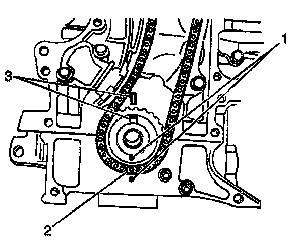 - The yellow link of the crankshaft timing chain (2) is aligned with the crankshaft timing mark (1).