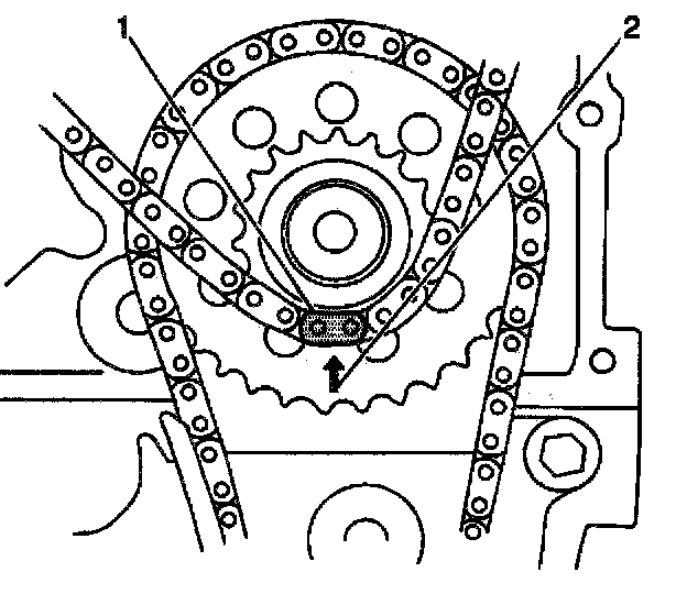 15. Align the yellow link (1) of the camshaft timing chain with the arrow (2) on the idler sprocket.