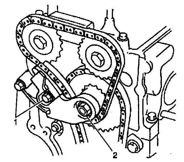 7. Install the timing chain fixed guide (2).